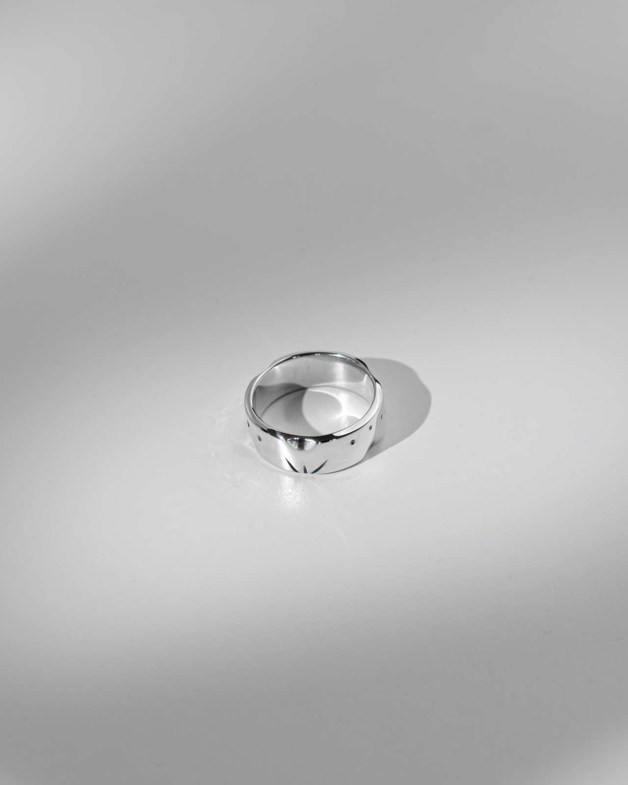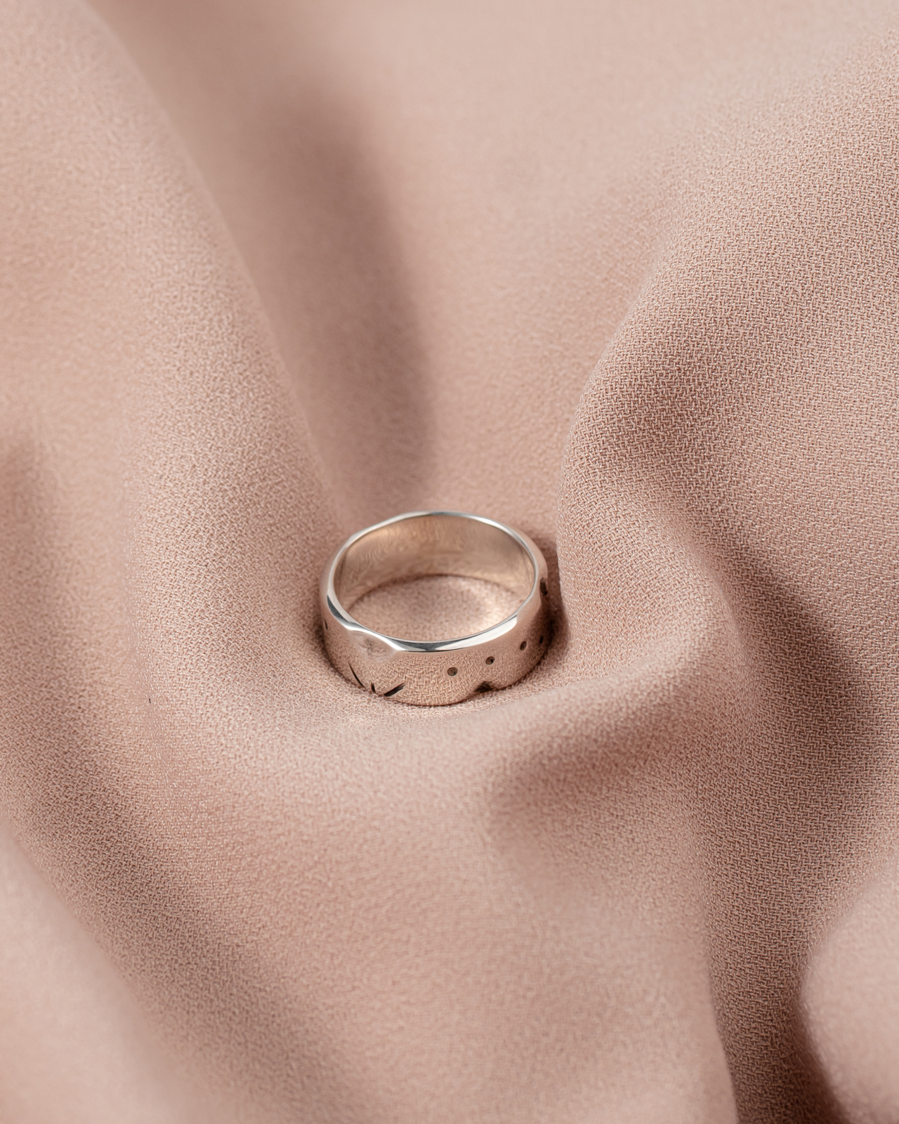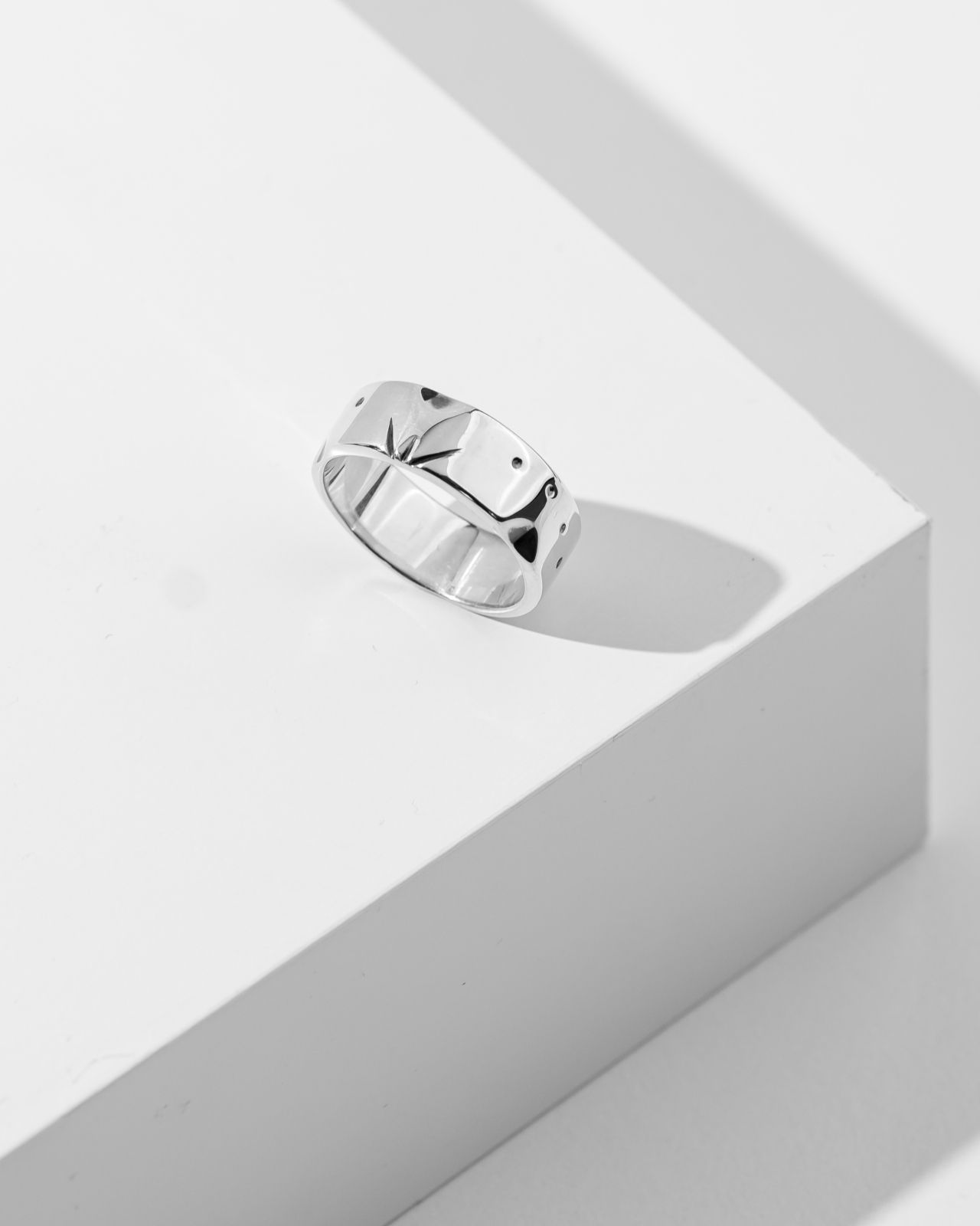 Un accesoriu de exceptie. Adauga acum caracter look-ului tau cu inelul nostru. Fabricat din argint aceasta piesa eleganta este împodobita cu puncte și linii care se îmbina pentru a crea un aspect unic. Fie ca îți accesorizezi ținuta pentru birou sau o ieșire de noapte acest inel va fi completarea perfecta pentru personalitatea ta.